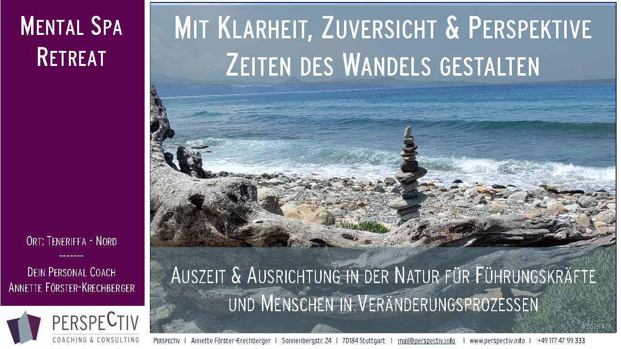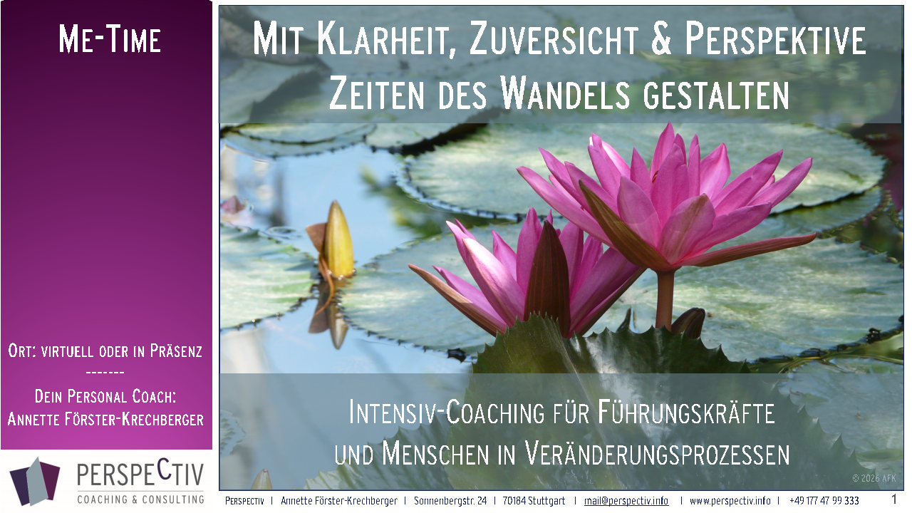 PERSPECTIV ist ein Netzwerk von Expertinnen und Experten, die jeweils bestimmte Kompetenzfelder abdecken. Gerne sind wir einzeln oder im Team für Sie da. Inhaberin von PERSPECTIV ist die Theologin, Pädagogin und ausgebildete Personal- und Organisationsentwicklerin Annette Förster-Krechberger. Sie gründete das Beratungsunternehmen mit Sitz in Stuttgart im Jahr 1990.